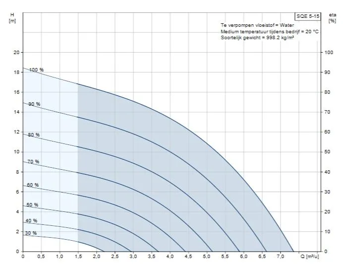 De Grundfos SQE 5-15 bronpomp is van hoge kwaliteit en frequentie gestuurd. De pomp heeft een variabel toerental en is daardoor energiebesparend. Deze meertraps centrifugaalpomp is compact en kan geïnstalleerd worden in een boorgat met een minimale diameter van 76 mm (3").