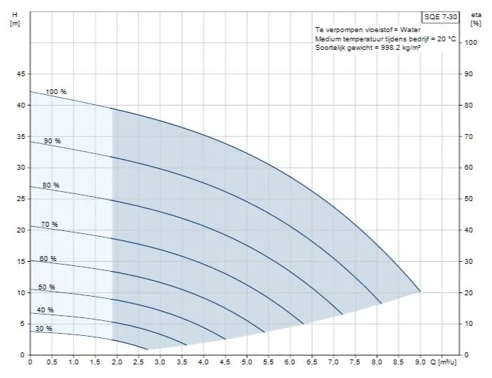 De  Grundfos SQE 7-30 bronpomp  is  van hoge kwaliteit en frequentie gestuurd. De pomp heeft een variabel toerental en is daardoor energiebesparend. Deze meertraps centrifugaalpomp is compact en kan geïnstalleerd worden in een boorgat met een minimale diameter van 76 mm (3").