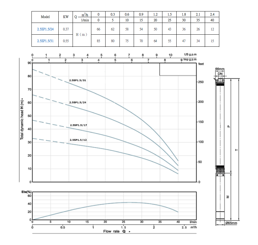De pomp is geschikt voor montage in bronnen van minimaal inwendig 69 mm.