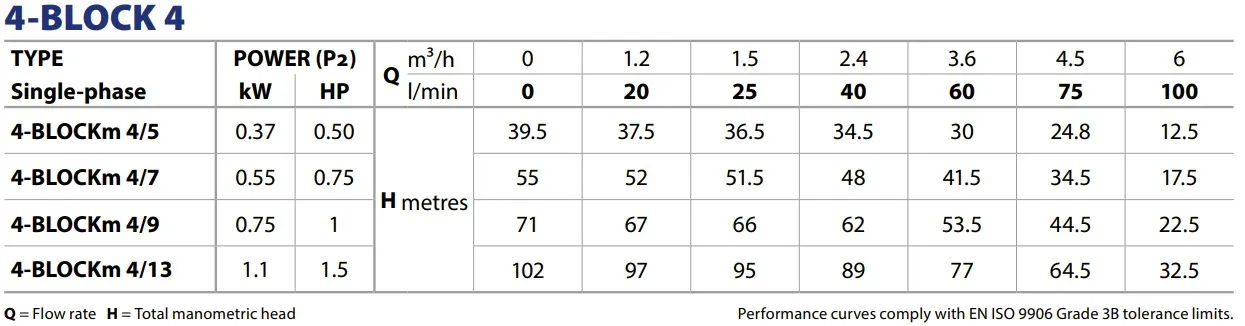 Pedrollo 4BLOCK m 4/13 bronpomp heeft een 4" diameter en is voorzien van ingebouwde condensator en thermische beveiliging. Hierdoor is geen aansluitkast benodigd en er hoeft dan ook geen pompkabel gelast te worden aan de voedingskabel.
