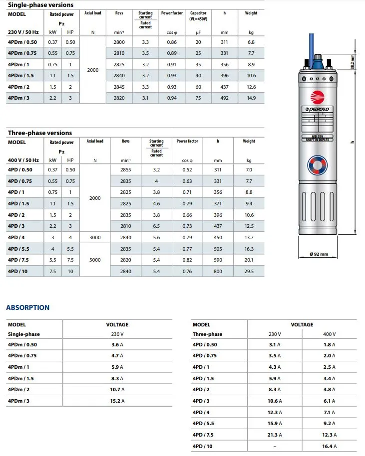 De Pedrollo 4PDm / 2,0 is een losse 230 volt 2,0PK 1,5 kW motor t.b.v. 4 (Ø 98mm) hydraulische Pedrollo bronpomp delen. De Pedrollo 4PDm / 2,0motor is volledig uitgevoerd in RVS AISI 316 en standaard voorzien van 1,5 meter FE4DM/T onderwater stroomkabel (extra lengte kabel is ook mogelijk).