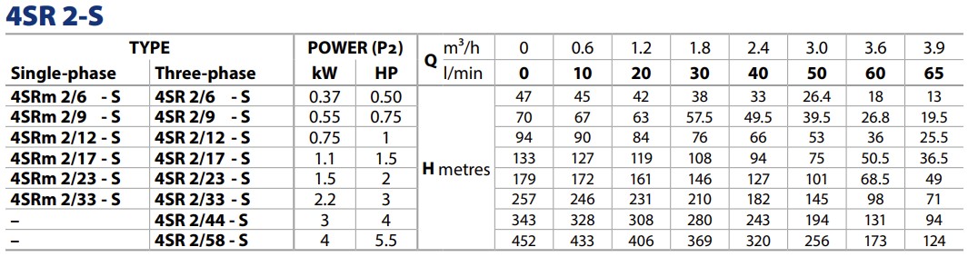De 4SR2/6-S heeft een motorvermogen nodig van 0,5 PK / 0,37KW. in een 230v. of 400v. uitvoering.